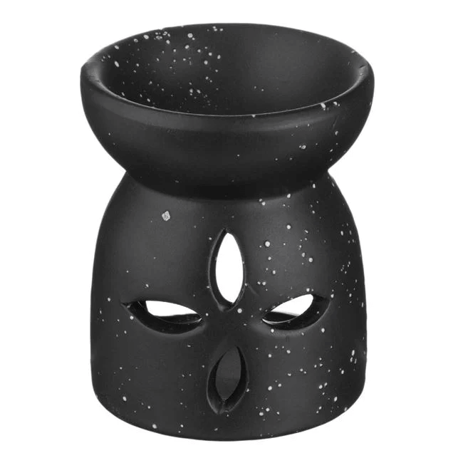 Διακοσμητική βάση λαδιού, κεραμική σε μαύρο ματ χρώμα με κίτρινες πιτσιλιές και διάτρητο λουλούδι.