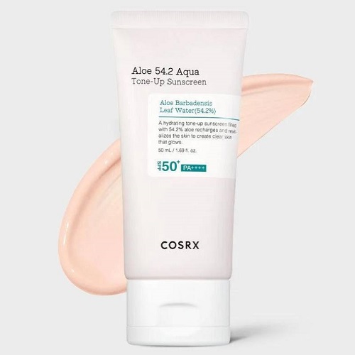 COSRX – Aloe 54.2 Aqua Tone-up Sunscreen SPF50+ PA++++ – ένα ελαφρύ, ενυδατικό αντηλιακό τόνωσης με σύνθεση που περιέχει εκχύλισμα αλόης για να καταπραΰνει το δέρμα, παρέχοντας παράλληλα ισχυρή προστασία από την υπεριώδη ακτινοβολία και ένα λαμπερό, ομοιόμορφο φινίρισμα.