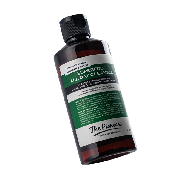 Το Superfood all day cleanser σχεδιάστηκε για να καλύψει τα πολύ απαιτητικά δέρματα που αναζητούν το καθαριστικό που θα τους κλέψει την καρδιά! Το χειροποίητο αυτό σαπούνι παρασκευάζεται στη Cook Lab με μία ειδική και ξεχωριστή μέθοδο που καθιστά το προιόν αυτό ιδανικό για όλους τους τύπους δέρματος, όλες τις ανάγκες, όλες τις εποχές!