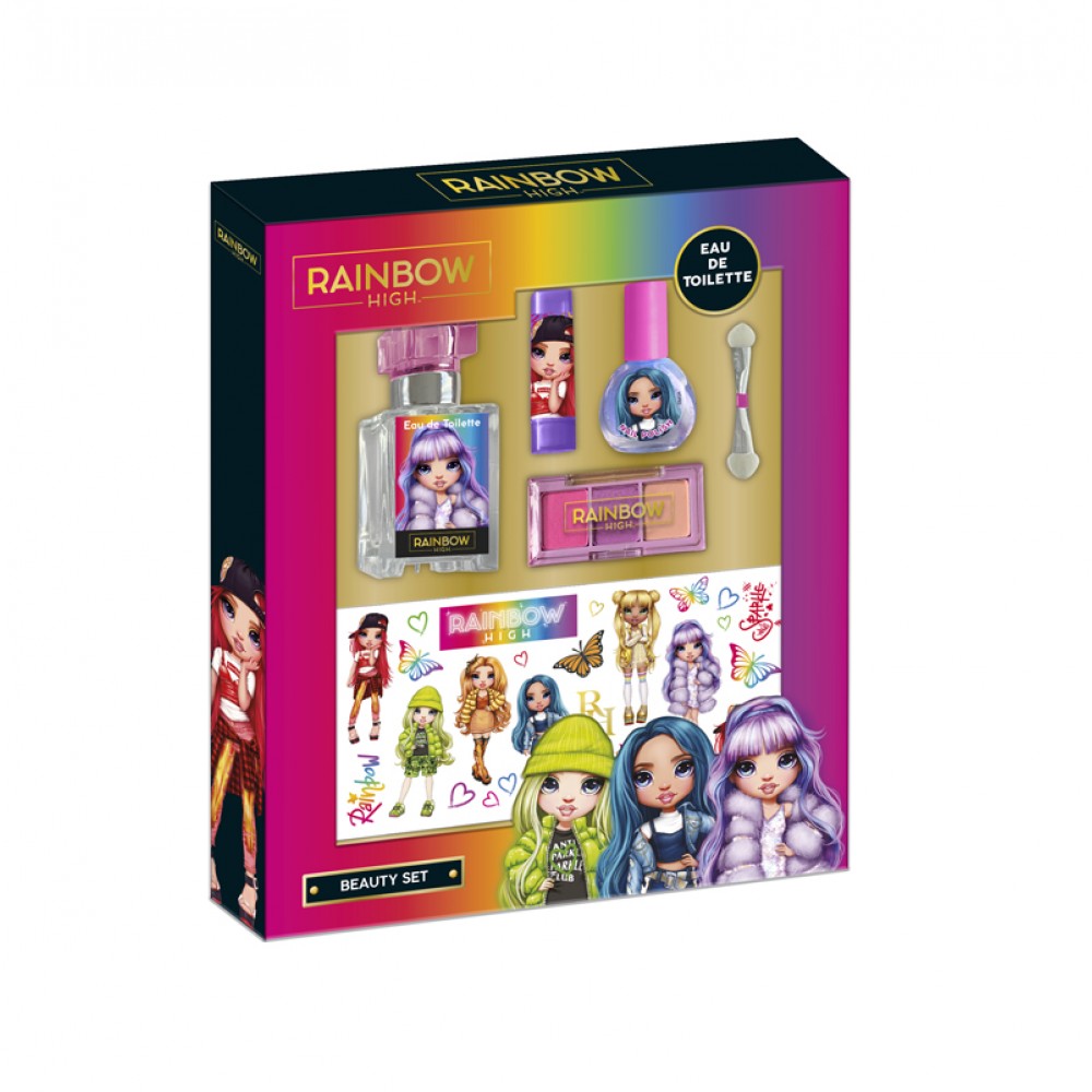 Rainbow High Beauty Set παιδικό σετ που περιλαμβάνει 1 υδατοδιαλυτό βερνίκι νυχιών σε γαλάζιο χρώμα, αυτοκόλλητα τατουάζ σε σχέδια Rainbow High, 1 παλέτα με 2 σκιές ματιών και 1 ρουζ, 1 lipstick, 1 πινελάκι και 20ml άρωμα . Δερματολογικά Ελεγμένα.